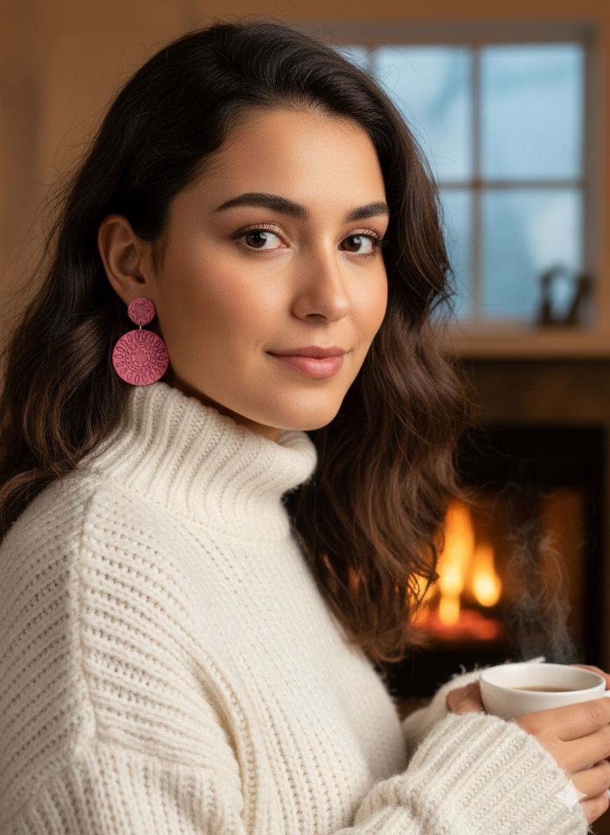 Beautiful barbie pink round dangle featuring snowflake embossing details.