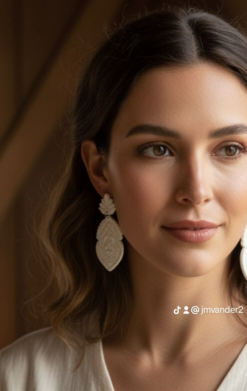 Elevate your style with these elegant statement earrings featuring an intricate textured design. The delicate ivory-toned drops showcase a beautiful embossed pattern that catches the light beautifully. Lightweight and versatile, these earrings add a touch of bohemian sophistication to both casual and dressy ensembles. The soft neutral shade complements any skin tone and pairs effortlessly with everything from flowing white blouses to evening wear.