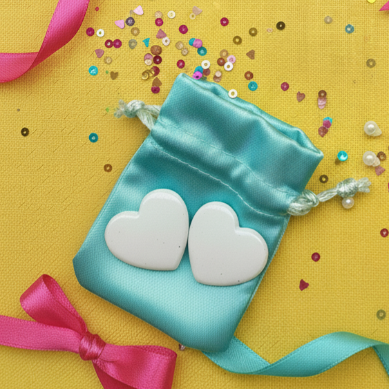 These charming heart-shaped stud earrings feature a pristine white finish with an elegant shimmer that catches the light beautifully. Handcrafted from lightweight polymer clay, they offer comfortable all-day wear while adding a touch of romance to any outfit. The smooth, glossy surface gives these earrings a polished, refined look perfect for both casual and dressy occasions.